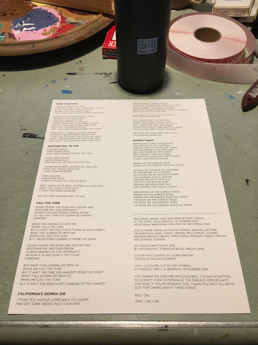 In June of 2015 Andrew Bryant, Grove Randolph Robinson and I rolled up to the Echo Lab in Argyle, Texas. The silver (not gray!) GMC Safari called Barbara Vanwyck, (no AC, but otherwise a damn good vehicle) had made the trip in fine form. In hindsight, though, there were omens; precursors to what was in store for the record. As I write this now, it seems almost poetic. Texas had just been visited by historically torrential rains, and as we wound our way to the studio (which was in the sticks) we discovered that the county road we were following was completely flooded and impassable. I remember we just stopped and got out, unsure of how to proceed, surprised by the small lake where a road should have been. It was early evening, hot, and we’d just driven a long way. Even though we’d known about the rain bombarding north Texas, it hadn’t really occurred to any of us that we’d get so close to our destination only to be prevented from actually getting there. Looking back, that was pretty much the story of Water Liars—traveling far, working hard, only to come up short. The oldest story in the book, I know. But it was ours, too. That night, we were able to backtrack and eventually find our (much more roundabout) way to the Echo Lab. Over the next ten days we worked harder, spent more time and money than we ever had, by a damn sight, on a record that we hoped would lift us a couple rungs on the ladder of “success”. We had a good time making it, too. For much of my 20s and early 30s I never really felt at home anywhere, but for those ten days in Argyle I can honestly say that those rooms and that porch somehow felt like home to me. We slept in bunkbeds like brothers, lived on peanut butter and jelly sandwiches and granola bars, shot BB guns at beer cans, kept an eye out for scorpions. We were infinitely fortunate to hang out and work for ten days with Matt Pence, a musical and studio engineering hero to each of us. It was our further good fortune that Matt was in the habit of piling his fine dogs, Hoagie and Rufus, into his van each morning before heading over to the studio. Hoagie was deaf and had to wear a red flashing light on his collar so he could be found if he wandered into the woods at night. I remember sitting on the back porch, listening to the crickets and the whippoorwill that would sing every night and watching Hoagie’s red light, and feeling happy. It was the best of times; it was the worst of times. We worked long hours and we thought we were on the right track.